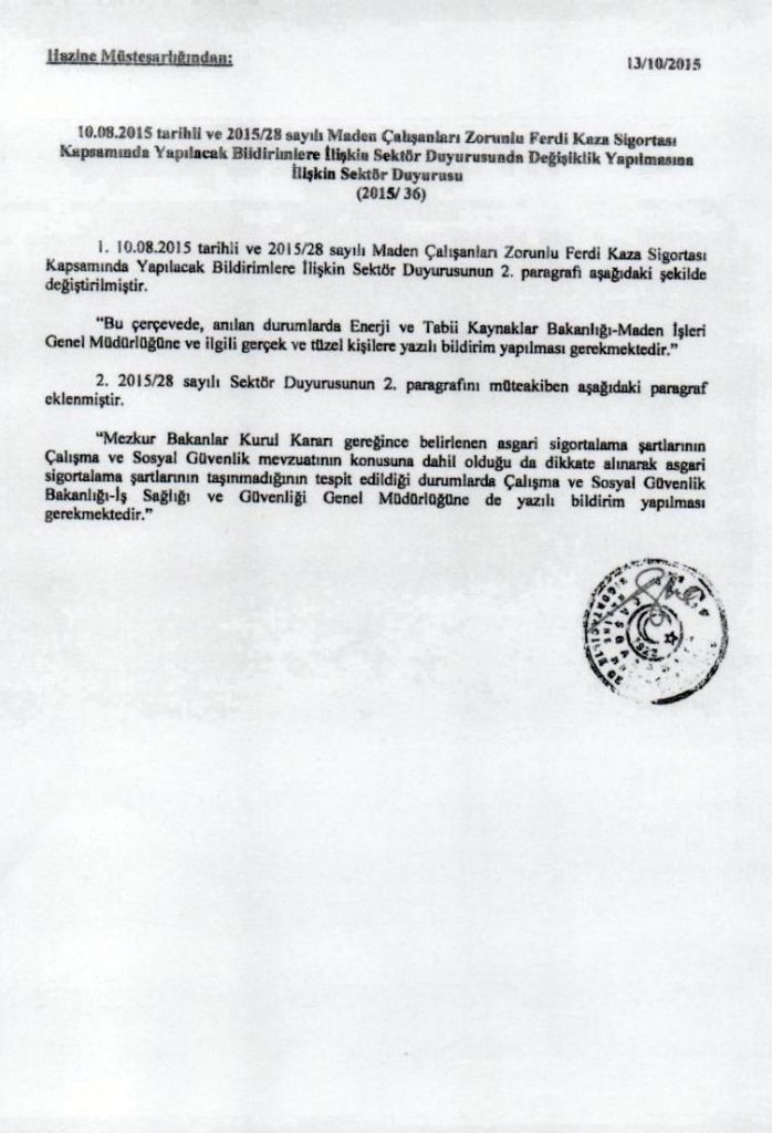 Maden Çalışanları Zorunlu Ferdi Kaza Sigortası Kapsamında Yapılacak Bildirimlere İlişkin Sektör Duyurusunda Değişiklik Yapılmasına İlişkin Sektör Duyurusu 2015-36