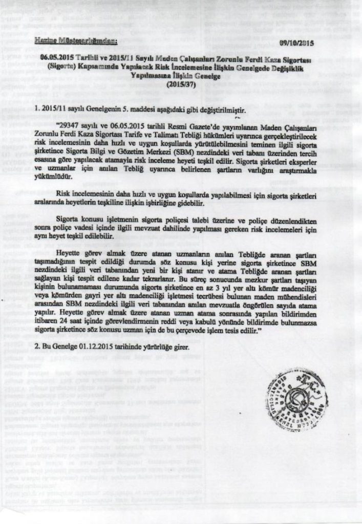 Maden Çalışanları Zorunlu Ferdi Kaza Sigortası Kapsamında Yapılacak Risk İncelemesine İlişkin Genelgede Değişiklik Yapılmasına İlişkin Genelge 2015/37