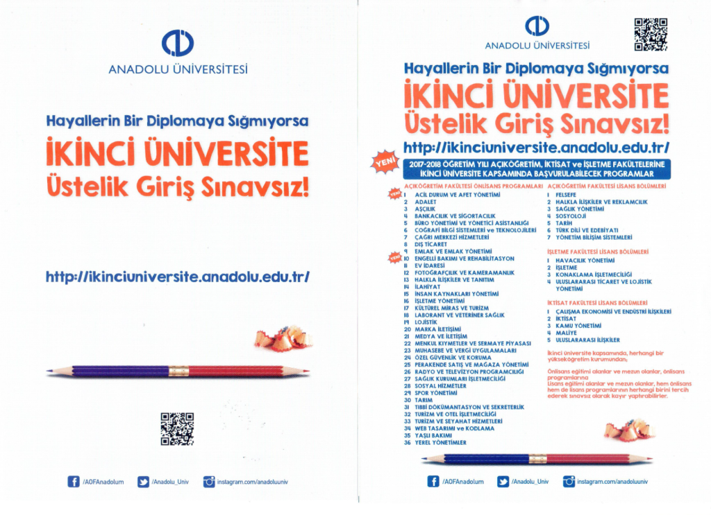 Anadolu Üniversitesi Açıköğretim Fakültesi tarafından derneğimize gönderilen eğitim programlarına ilişkin tanıtım broşürleri ekte yer almakta olup, ilgilenen üyelerimizin bilgilerine sunarız.