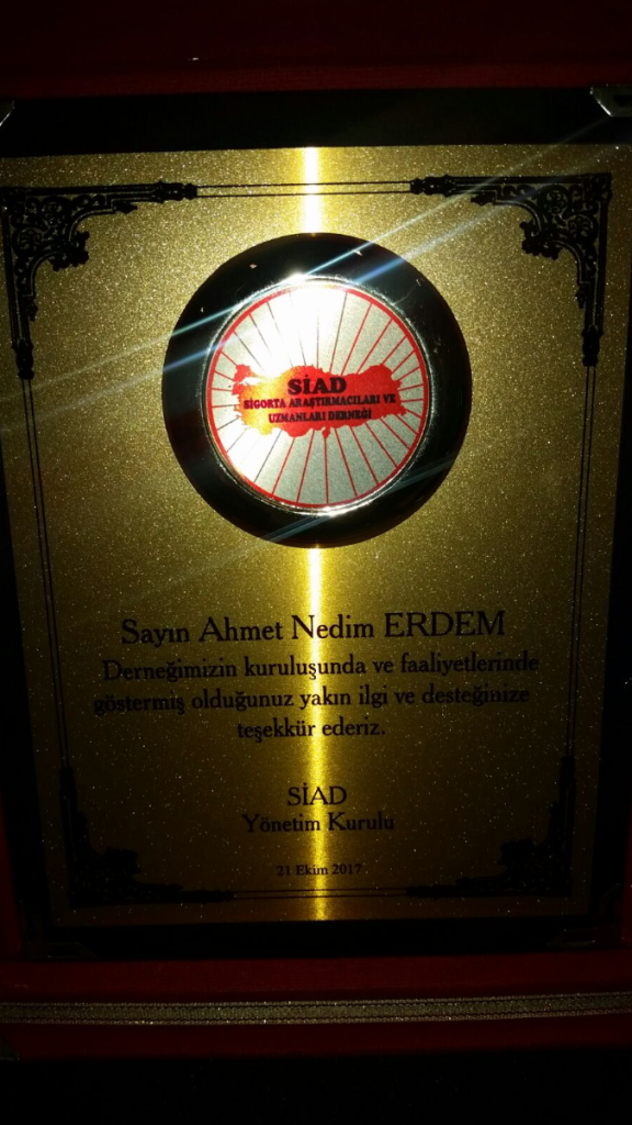 Sigorta Araştırmacıları ve Uzmanları Derneği SİAD’ ın 1. Olağan Genel Kurul Toplantısı 21/10/2017 tarihinde İstanbul Radisson Blu Conference & Airport Hotel’ de gerçekleştirildi. Toplantıda SİAD’ ın Kuruluşu ve Faaliyetleri ile ilgili desteklerinden dolayı Dernek Başkanımız Sayın Ahmet Nedim ERDEM’ e plaket verildi. Toplantıya SED’ i temsilen Yönetim Kurulu Üyelerimiz Sayın Oğuz Vasıf İPKİN ve Sayın Murat Cumhur YENİHAYAT katıldılar. SİAD Başkanı Sayın Aydın ELİDAR tarafından verilen plaketi Sayın Ahmet Nedim ERDEM adına alan Sayın Oğuz Vasıf İPKİN konuşmasında, SED’ in 15 ayrı Bölge ve İl Temsilciliği ile birlikte SİAD’a her türlü destek ve iş birliğine açık olduğunu ifade etti.