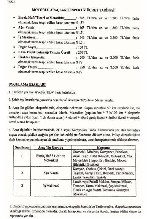 “(1) Uygulanacak taban ekspertiz ücret tarifeleri Ek-1 ve Ek-2 ile belirlenmiştir.”
