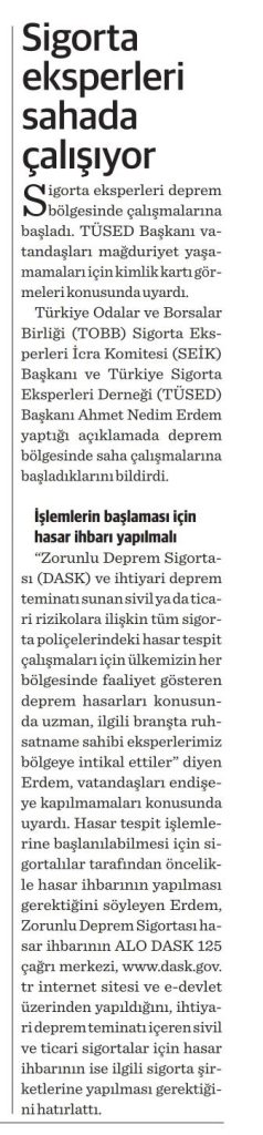 TOBB SEİK ve Dernek Başkanımız Sayın Ahmet Nedim ERDEM ‘in Deprem ile ilgili Dünya Gazetesinde Yayımlanan Haberi