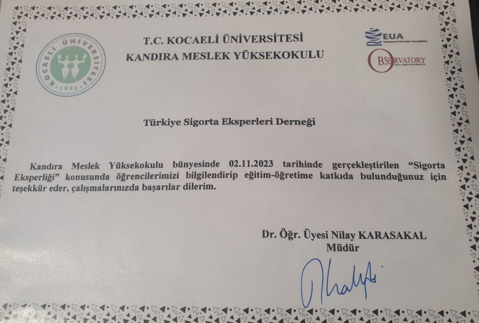02 Kasım 2023 tarihinde Türkiye Sigorta Eksperleri Derneği ve Sigorta Eksperleri Dayanışma ve Eğitim Vakfı olarak Kocaeli Üniversitesi Kandıra Meslek Yüksekokulu Bankacılık ve Sigortacılık Bölümü Öğrencileri ile bir araya geldik.