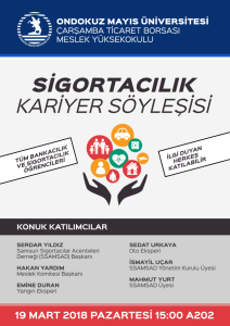 Dernek Üyelerimiz Sayın Sedat URKAYA ve Sayın Emine DURAN 19 Mart 2018 Pazartesi günü saat 15:00 da 19 Mayıs Üniversitesi Çarşamba Ticaret Borsası Meslek Yüksekokulunda düzenlenen Sigortacılıkta Kariyer Olanakları Söyleşisine katıldılar. Söyleşinin açılışında konuşan Bankacılık ve Sigortacılık Programı Bölüm Başkanı Öğr. Gör. Sayın Abdulkadir ERYILMAZ, mesleki yeterliliğe sahip, araştıran devamında sektörün insan kaynakları ihtiyacına cevap …
