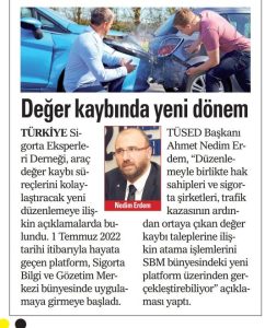 Araç değer kaybı mercek altında Türkiye Sigorta Eksperleri Derneği, araç değer kaybı süreçlerini kolaylaştıracak yeni düzenlemeye ilişkin açıklamalarda bulundu. TÜSED Başkanı Ahmet Nedim Erdem “Hak sahipleri, herhangi bir trafik kazası sonrasında değer kaybı taleplerine ilişkin eksper atamalarını SBM bünyesindeki platform üzerinden gerçekleştirebiliyor. Ayrıca eksper atama işlemleri dışında, sigorta eksperlerinin platform üzerinden hazırlayacağı rapora itiraz edilebilecek, itiraz eksperi …