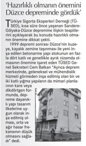 Türkiye Sigorta Eksperleri Derneği, Düzce depremine ilişkin tespitlerini paylaştı Ülkemizin en köklü derneklerinden birisi olan Türkiye Sigorta Eksperleri Derneği, geçtiğimiz günlerde yaşanan Sarıdere Gölyaka Düzce Depremi’ne ilişkin tespitlerini kamuoyuyla paylaştı. Kapsamlı bir açıklama yapan TÜSED Genel Sekreteri Cem Balkan, 2020 yılında İzmir’de yaşanan depremi hatırlatarak, Düzce bölgesinin, 1999 yılında yaşanan depremin etkisiyle olası depremlere daha …